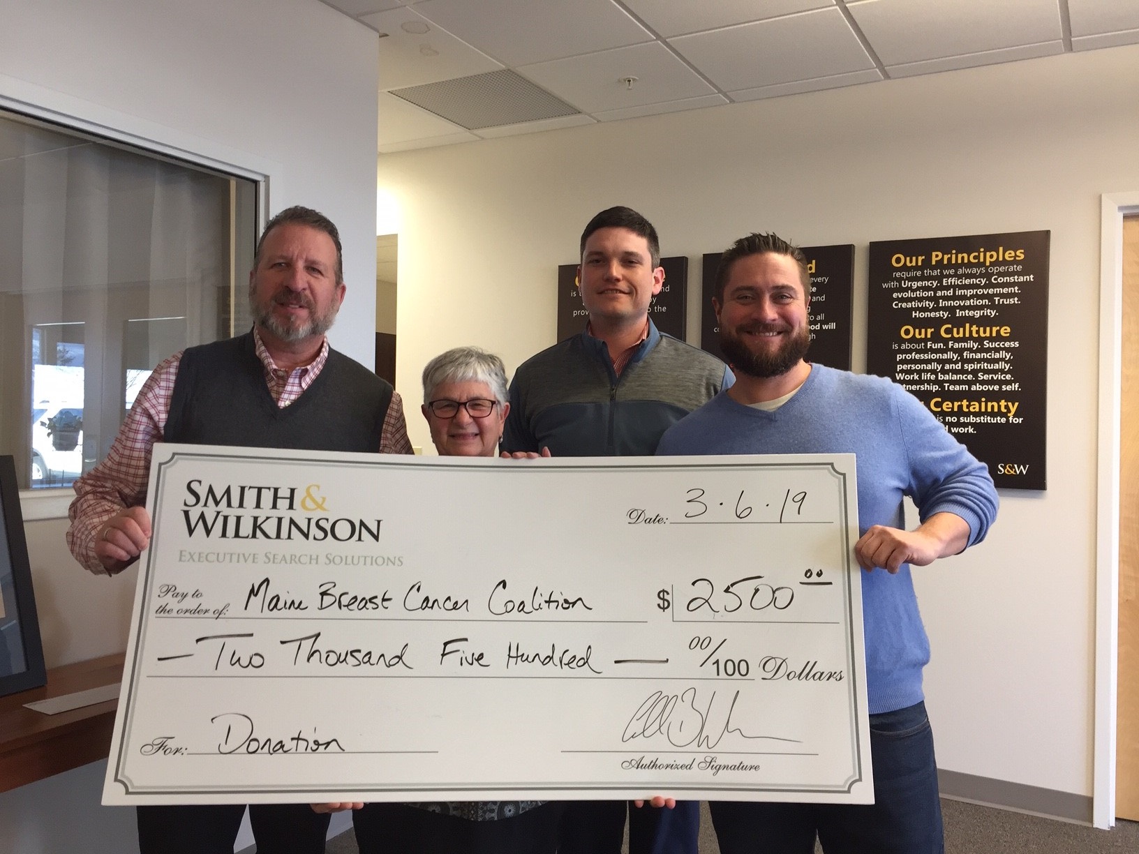 “Giving back is an important part of our culture and builds upon our commitment to making a difference, whether it’s using our skills and experience to match companies and talent, or contributing to non-profit organizations that help others. The Maine Breast Cancer Coalition (MBCC) provides financial support through their Support Service Fund to many of the 1,350 Maine women who are diagnosed with breast cancer each year, and also focuses on advocacy and education. We are pleased to recognize and support the positive impact that the MBCC makes in hundreds of lives through this contribution,” said Carll Wilkinson, Managing Partner of Smith & Wilkinson.